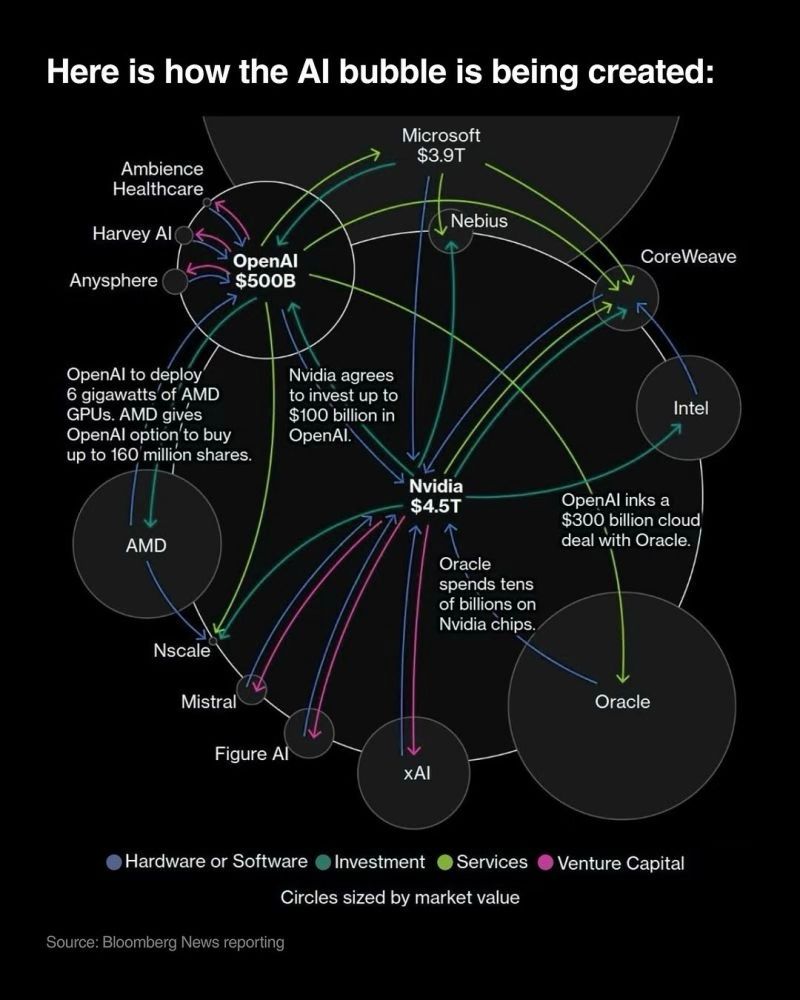 Artificial Intelligence (AI). The same way the internet was one of the biggest technological innovations or advances in the past 30 years, Artificial Intelligence (AI) is going to be the biggest technological advancement in the years to come. Hundreds of billions, if not trillions, of dollars are being committed and invested to build the supporting infrastructure and similar to the early 2000s, there is now a lot of conversation about “bubbles.” This chart from Bloomberg about a month ago illustrated best why the concerns are increasing.