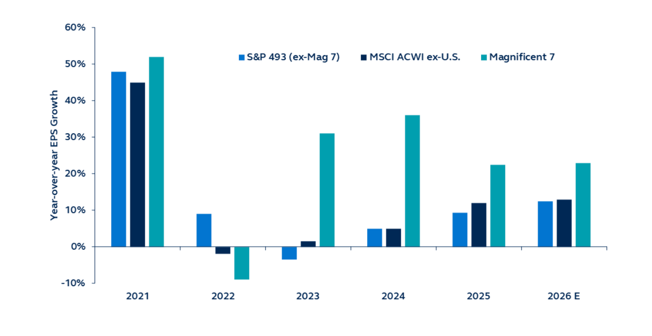 AI is the sector that is most scrutinized due to importance in growth for the markets and also the relative sizing in the Magnificent 7 and hence the outsized weight in the major indices. As can be seen below, these companies have made up a big percentage of year-over-year growth and will continue to be so…